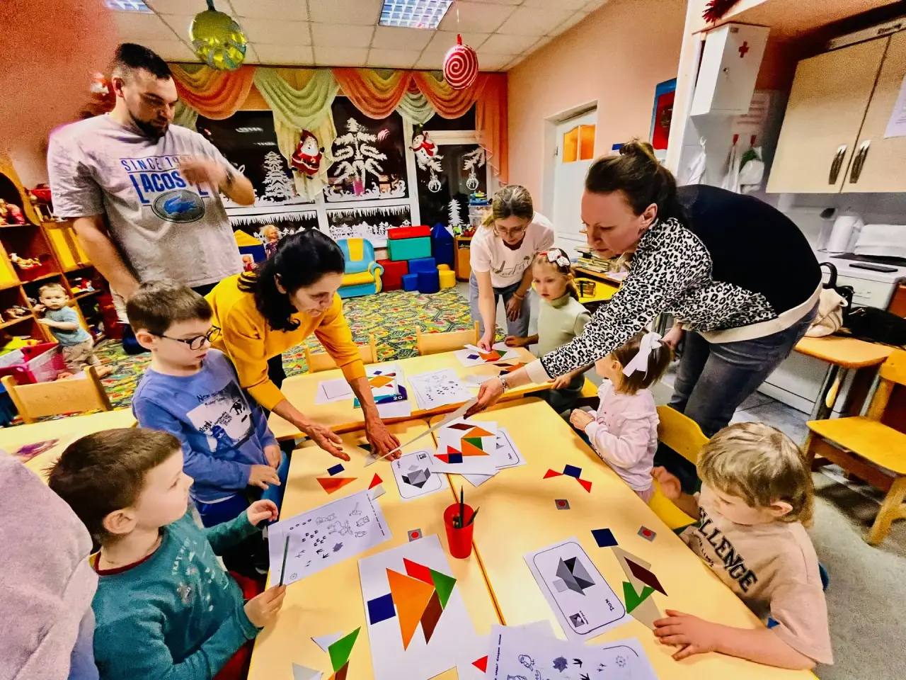 Чтобы научиться праздничному волшебству, детям и родителям пришлось объединиться в команды и пройти увлекательный квест! Они решали логические задачки, собирали пазлы, танцевали и помогали друг другу.